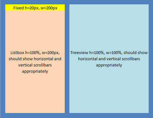 I am trying to implement the layout that is depicted in the attachment. The blue container has height/width 100% to fill available space. There are two columns. The left column has a fixed width and the right column is fluid. The left column contains a listbox and the right column contains a treview. I achieve the layout with a table. I am having difficulty getting the listbox and treeview to properly display their scrollbars when necessary.