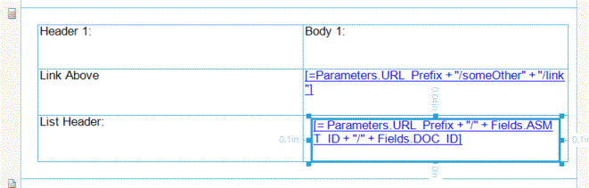 The list is attached to, let's say, dataSource2 and the table is attached to dataSource1. The list is returning a textbox with a URL inside of it and a different ID at the end. So if there are 3 ID's coming from dataSource2, it generates 3 links. I have set the behavior to make the text blue and underlined, like a traditional hyperlink.