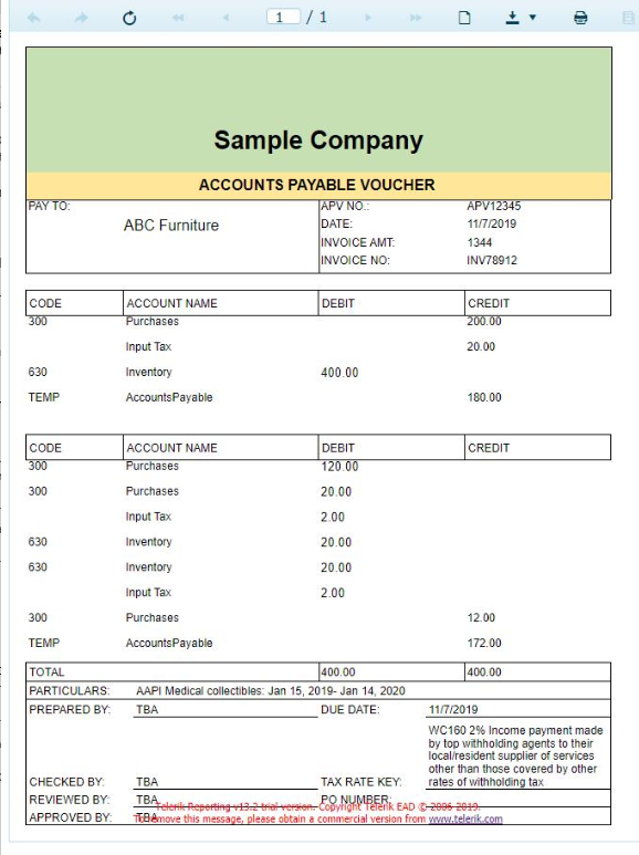 public class APV{ public string VendorName { get; set; } public DateTimeOffset ReportDate { get; set; } public string APV_NO { get; set; } public string INV_NO { get; set; } public decimal? INV_AMT { get; set; } public decimal? TOTAL_DEBIT { get; set; } public decimal? TOTAL_CREDIT { get; set; } public IEnumerable<AccountStatement> AccountStatements { get; set; }}public class AccountStatement{ public string AccountCode { get; set; } public string AccountName { get; set; } public decimal? Debit { get; set; } public decimal? Credit { get; set; }}