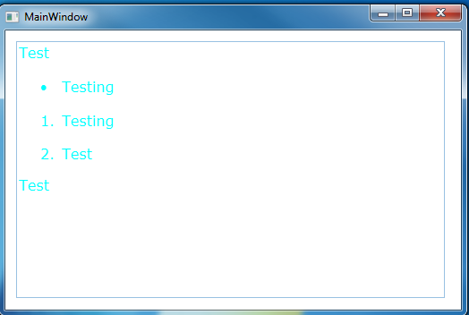 <p><span>Test</span></p><ul> <li><span>Testing</span></li></ul><ol> <li><span>Testing</span></li> <li><span>Test</span></li></ol><p><span>Test</span></p>We're assigning that to the RichTextBox by calling an (instance of the bound HtmlDataProvider) htmlDataProvider.Html = "our html string"