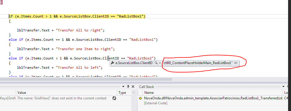 e.SourceListBox.SelectedValue && e.SourceListBox.ClientID == "RadListBox1" but I cant compare them obviously so how I get the selectedvalue of the selected item on a specific listbox?