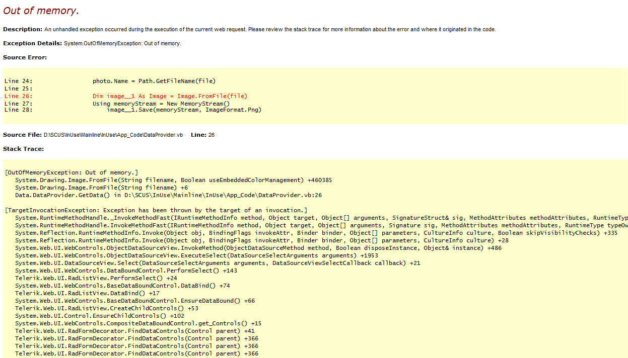 I am getting the Out of Memory exception. I have attached the code and error.