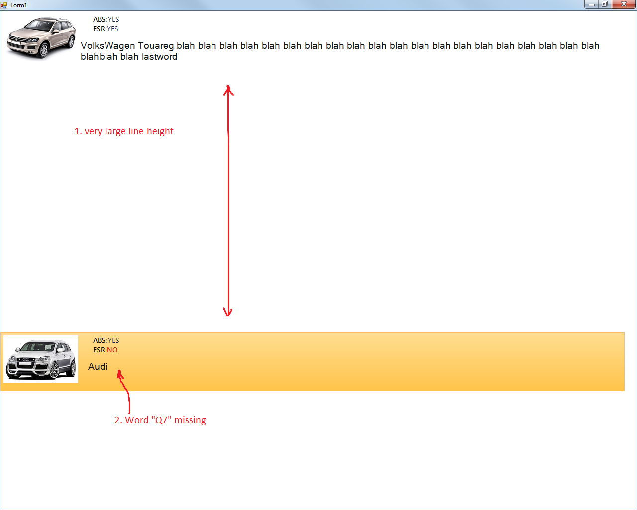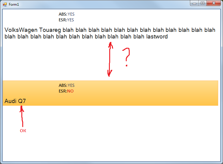 protected override void SynchronizeProperties() { base.SynchronizeProperties(); Cars car = (Cars)Data.Value; this.Text = "<html><br><br><br><br><br><span style=\"color:#141718;font-size:14.5pt;\">" + car.Model + "</span>"; this.element1.Text = "<html><span style=\"color:#010102;font-size:10.5pt;font-family:Segoe UI Semibold;\">" + "ABS:" + (car.ABS ? "<span style=\"color:#13224D;font-family:Segoe UI;\">YES" : "<span style=\"color:#D71B0E;\">NO") + "</span>" + "<br>ESR:" + (car.ESR ? "<span style=\"color:#13224D;font-family:Segoe UI;\">YES" : "<span style=\"color:#D71B0E;\">NO") + "</span>" + "</span>"; this.TextAlignment = ContentAlignment.TopLeft; this.ImageAlignment = ContentAlignment.TopLeft; //this fixes issue from 001.png this.TextWrap = true; }but, i will get the result shown on 002.png, where we have too big item height and second item does not seems to be shown correctly ("Q7" word is not shown).