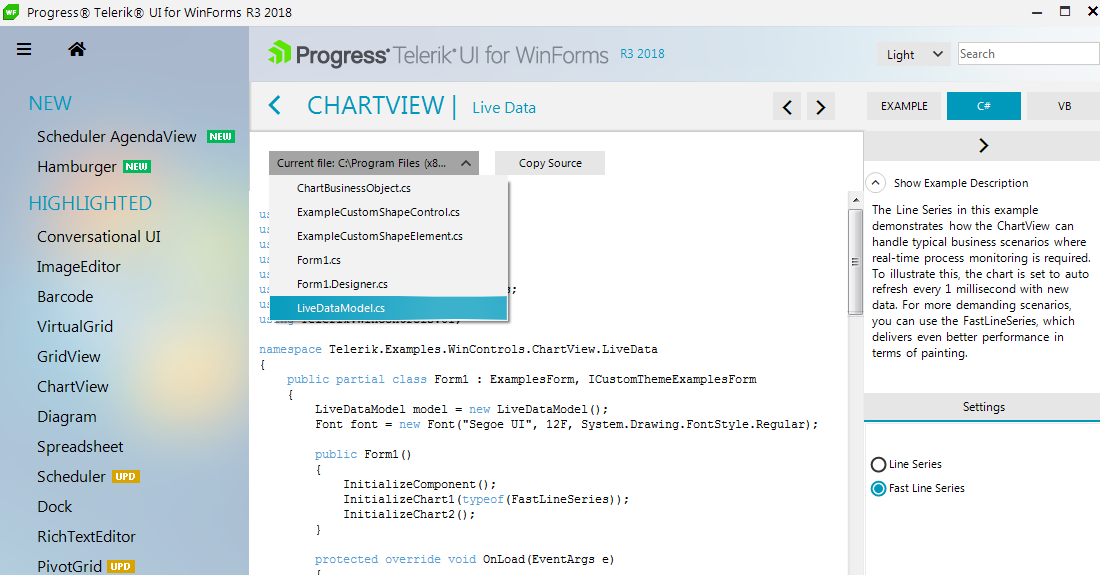 You can refer to the Demo application >> ChartView >> Live data example where you have access to the C# and VB.NET code. Thus, you can inspect how the data is loaded and updated when ticking the timer by using the custom implementation of the LiveDataModel.