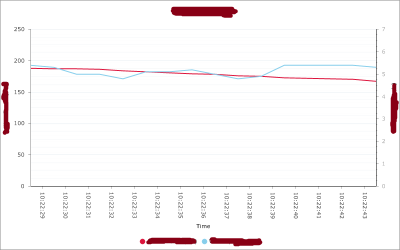 <telerik:RadHtmlChart Width="500" runat="server" ID="RadHtmlChart1" Transitions="false"><PlotArea> <Series> <telerik:ScatterLineSeries DataFieldY="value" DataFieldX="axisXValue" > <LabelsAppearance Position="Left" DataFormatString="{1}"></LabelsAppearance> <TooltipsAppearance DataFormatString="{1}"></TooltipsAppearance> </telerik:ScatterLineSeries> </Series> <YAxis MaxValue="250" Step="50" Color="Orange" Width="3" MinValue="0"> </YAxis> <AdditionalYAxes> <telerik:AxisY MaxValue="7" Step="1" MinValue="0" Color="Red" Width="3"></telerik:AxisY> </AdditionalYAxes> <XAxis Type="Date" BaseUnit="seconds"> </XAxis></PlotArea></telerik:RadHtmlChart><script type="text/javascript">var startDate = new Date();function UpdateChart() { var chart = $find("RadHtmlChart1"), endDate = new Date(+startDate + 3000); chart._chartObject.options.xAxis.min = startDate; chart._chartObject.options.xAxis.max = endDate; chart._chartObject.options.xAxis.axisCrossingValue = [startDate, endDate]; //here you should implement your logic on creating the data source chart.set_dataSource([ { value: 190, axisXValue: startDate }, { value: 180, axisXValue: new Date(+startDate + 1000) }, { value: 205, axisXValue: new Date(+startDate + 2000) }, { value: Math.floor(Math.random() * (210 - 140 + 1) + 140), axisXValue: endDate } ]); chart.repaint();}Sys.Application.add_load(function () { UpdateChart(); window.setInterval(function () { startDate = new Date(+startDate + 1000); UpdateChart(); }, 1000);});</script>You can also find helpful information in the following online resources: