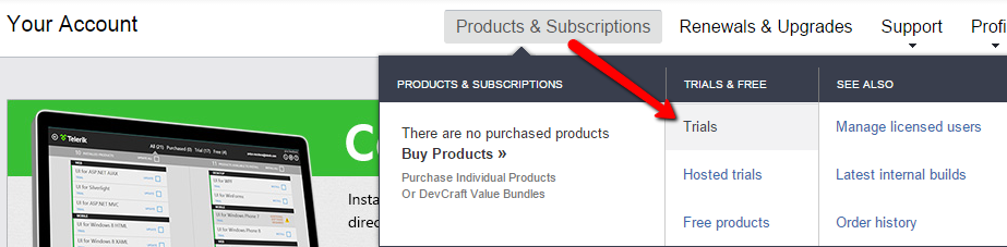 click the Trials item from the Products and Subsriptions menu at the top