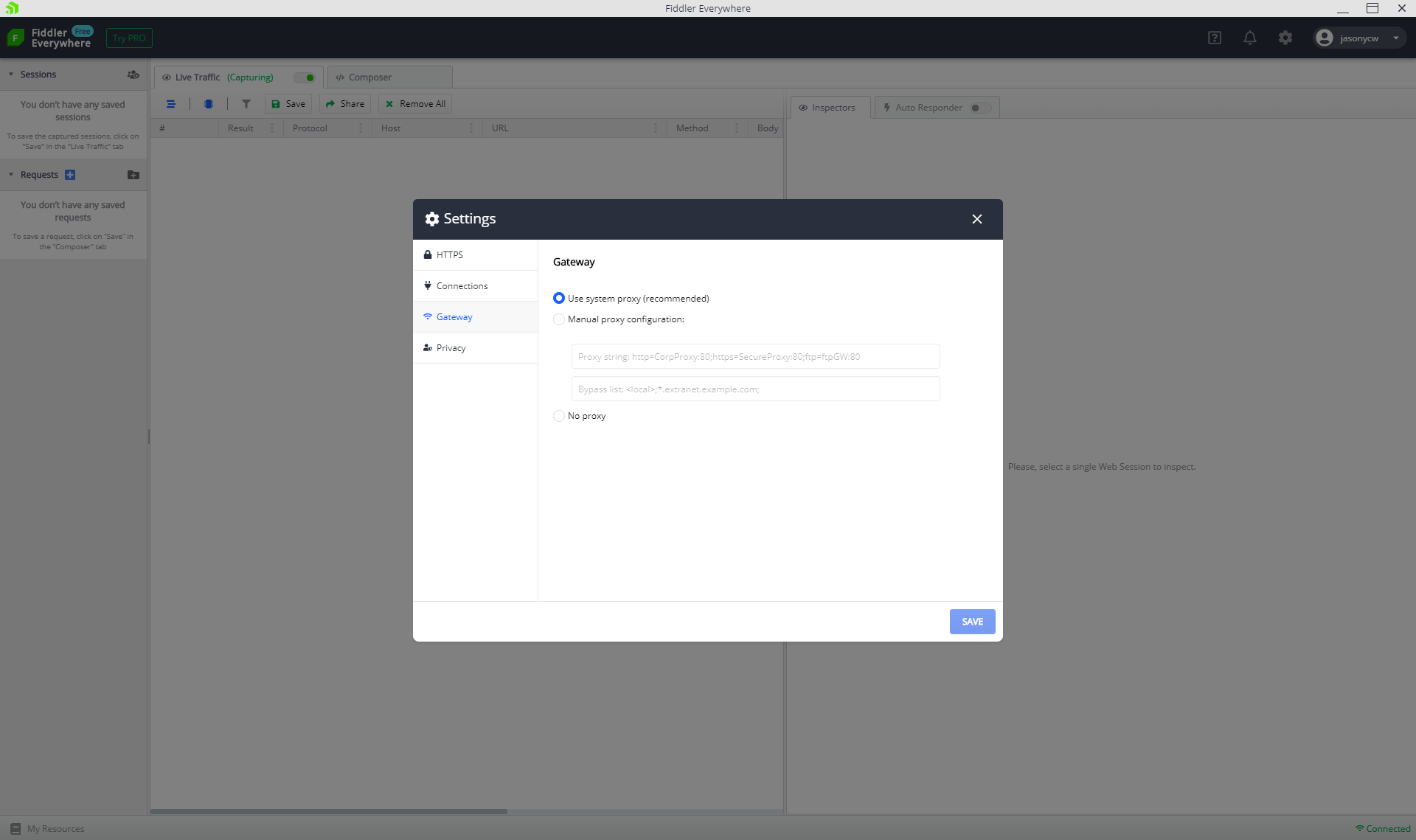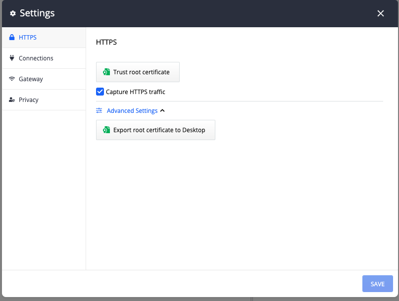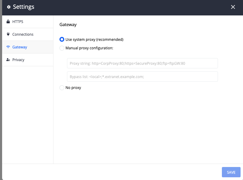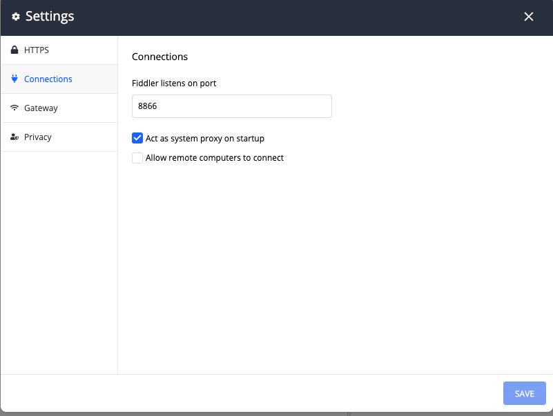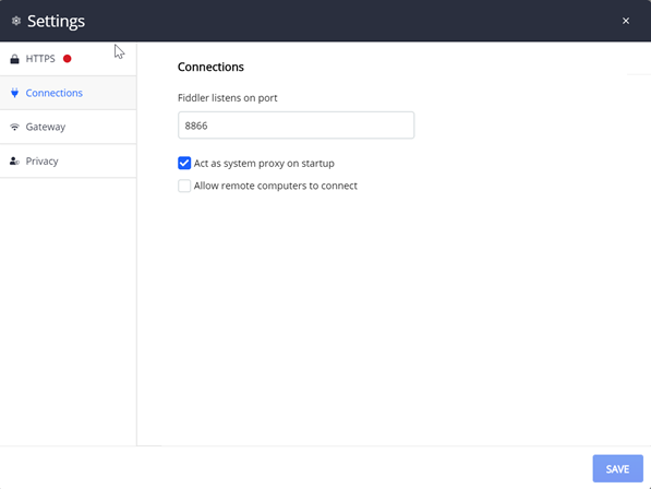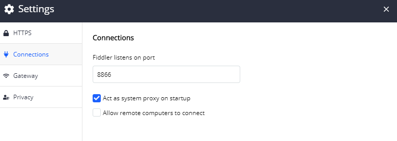 4. Can you share screenshots of the HTTPS, Connections and Gateway Tabs in the Fiddler Everywhere Configuration Settings as shown below screenshot.
