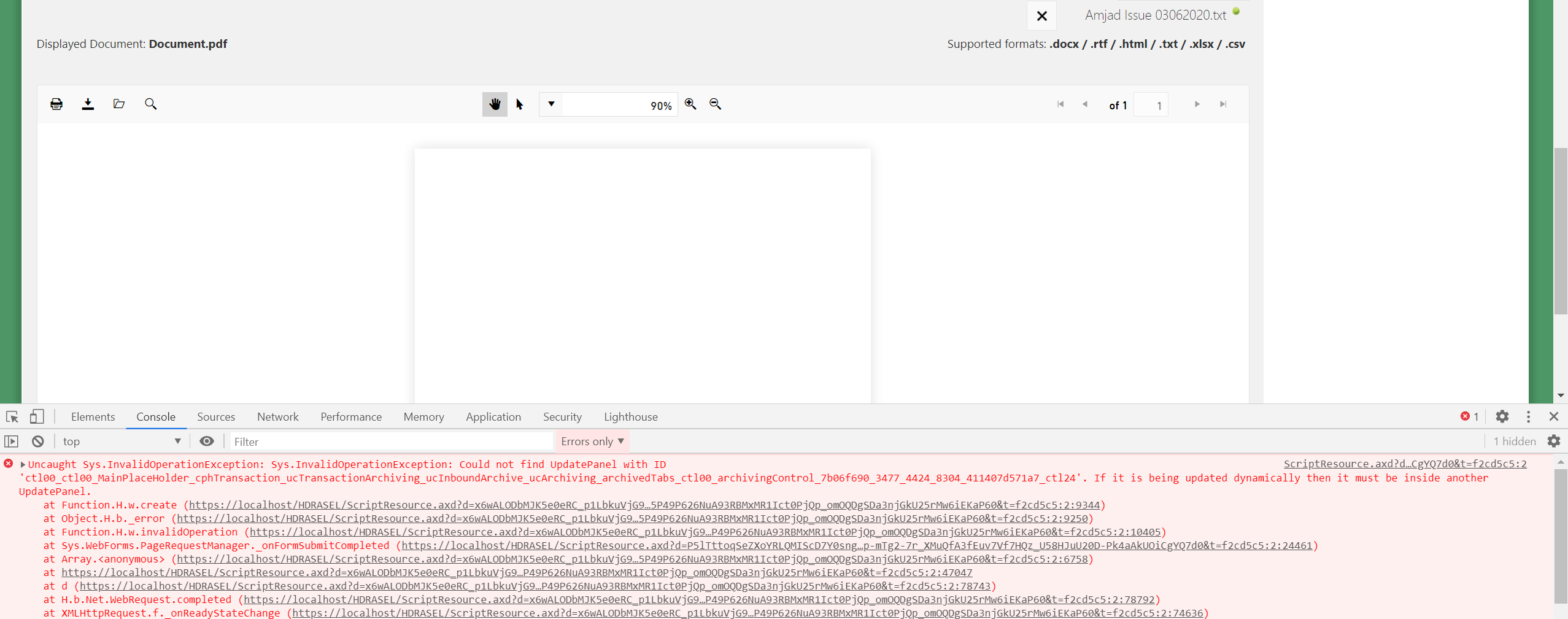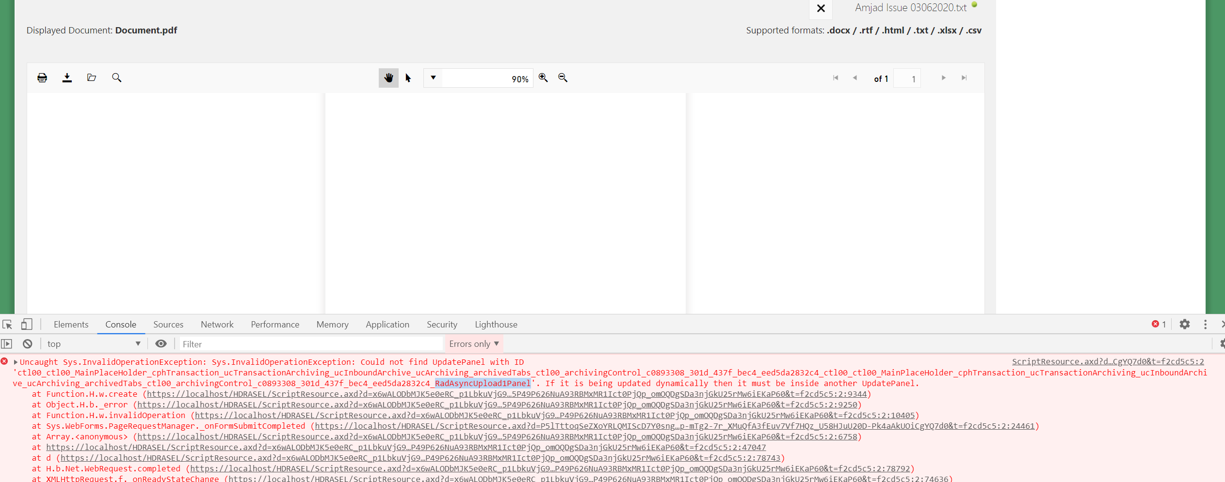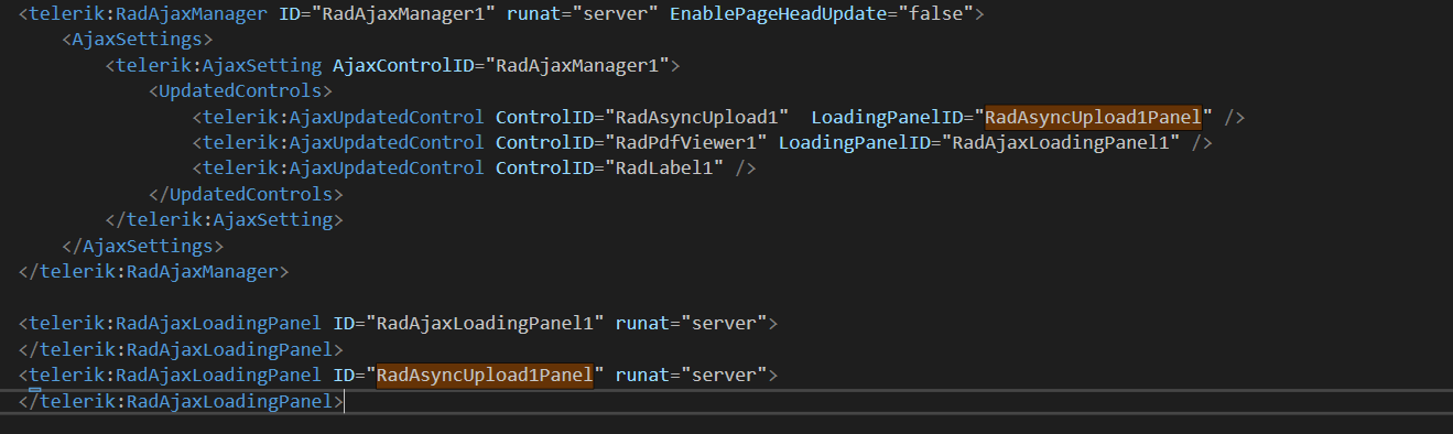 <script type="text/javascript" src="https://cdnjs.cloudflare.com/ajax/libs/pdf.js/2.2.2/pdf.js"></script><%@ Register TagPrefix="telerik" Namespace="Telerik.Web.UI" Assembly="Telerik.Web.UI" %><link href='<%# Page.ResolveUrl("~/UserControls/ArchivingPDF/css/styles.css") %>' rel="stylesheet" /><%--<form id="form1" runat="server">--%> <%-- <telerik:RadScriptManager runat="server" ID="RadScriptManager1" />--%> <telerik:RadSkinManager ID="RadSkinManager1" runat="server" ShowChooser="true" /> <script type="text/javascript"> window.pdfjsLib.GlobalWorkerOptions.workerSrc = 'https://cdnjs.cloudflare.com/ajax/libs/pdf.js/2.2.2/pdf.worker.js'; function pageLoad(app, args) { var upload = $find('<%= RadAsyncUpload1.ClientID %>'); $(upload.get_element()).find("input[type='file']").attr("accept", ".docx, .rtf, .html, .txt, .xlsx, .csv"); } function fileUploaded(sender, args) { $find('<%= RadAjaxManager1.ClientID %>').ajaxRequest(); } </script> <telerik:RadAjaxManager ID="RadAjaxManager1" runat="server" EnablePageHeadUpdate="false"> <AjaxSettings> <telerik:AjaxSetting AjaxControlID="RadAjaxManager1"> <UpdatedControls> <telerik:AjaxUpdatedControl ControlID="RadAsyncUpload1" /> <telerik:AjaxUpdatedControl ControlID="RadPdfViewer1" LoadingPanelID="RadAjaxLoadingPanel1" /> <telerik:AjaxUpdatedControl ControlID="RadLabel1" /> </UpdatedControls> </telerik:AjaxSetting> </AjaxSettings> </telerik:RadAjaxManager> <telerik:RadAjaxLoadingPanel ID="RadAjaxLoadingPanel1" runat="server"> </telerik:RadAjaxLoadingPanel> <div class="demo-container size-wide" runat="server"> <telerik:RadAsyncUpload ID="RadAsyncUpload1" runat="server" OnClientFileUploaded="fileUploaded" OnFileUploaded="RadAsyncUpload1_FileUploaded" AllowedFileExtensions=".docx,.rtf,.html,.txt,.xlsx,.csv" HideFileInput="true" AutoAddFileInputs="false" Localization-Select="Upload And Convert" EnableInlineProgress="false" MultipleFileSelection="Disabled" /> <telerik:RadLabel ID="RadLabel1" runat="server" Text="Displayed Document: <b>Document.pdf</b>" Style="float: left;"> </telerik:RadLabel> <telerik:RadLabel ID="RadLabel2" runat="server" Text="Supported formats: <b>.docx / .rtf / .html / .txt / .xlsx / .csv</b>" Style="float: right;"> </telerik:RadLabel> <br /> <br /> <br /> <telerik:RadPdfViewer runat="server" ID="RadPdfViewer1" Height="600px" Width="100%" Scale="0.9"> <%--<PdfjsProcessingSettings File='<%# Page.ResolveUrl("~/EmptyText.txt") %>'></PdfjsProcessingSettings>--%> </telerik:RadPdfViewer> </div><%--</form>--%>