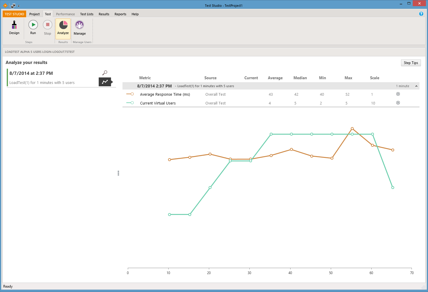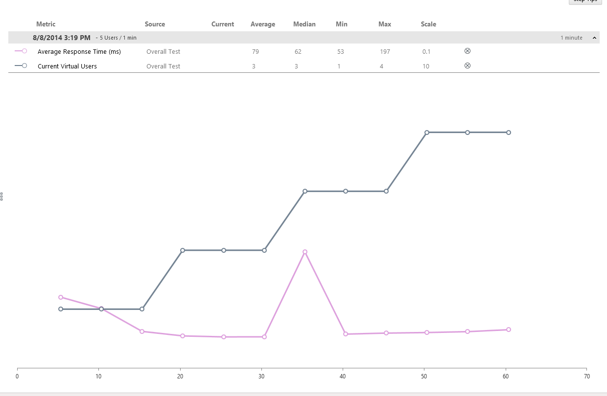 I should be getting an average of 20 Seconds (or 20,000 ms) per user but according to Test Studio its 155 and 197 ms respectively.