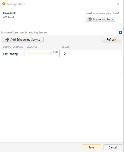 Then I click Manage, I see my machine as the scheduling service with 600 users as shown in screenshot.