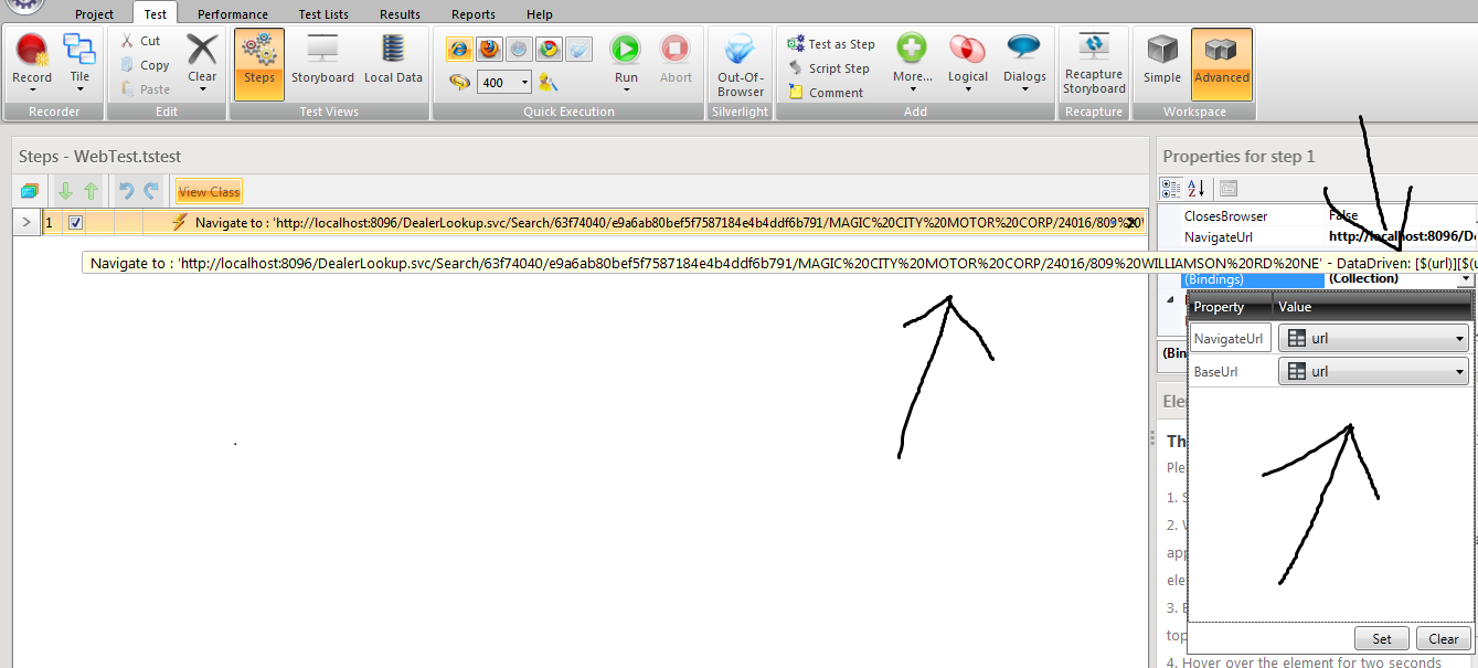 My requirement is like this. I nee to send some values through url and check the web service. I could bind excel sheet and send multiples urls as mentioned in the automation project.ex;- http://localhost:8096/Search.svc/63 and http://localhost:8096/Search.svc/64. So I need to create automation and load testing projects separately for this. I have successfully done the automation project for my requirement. Basically what I have done, was I recorded navigation url point in the automation project and bind the excel sheet with multiple values as screen shot 01. But this is not practical in load testing project. Get method is the only recorded field in the load testing project so we can't bind excel sheet for the load testing project as screen shot 02.So I have some queries on load testing project. Those are as follows.