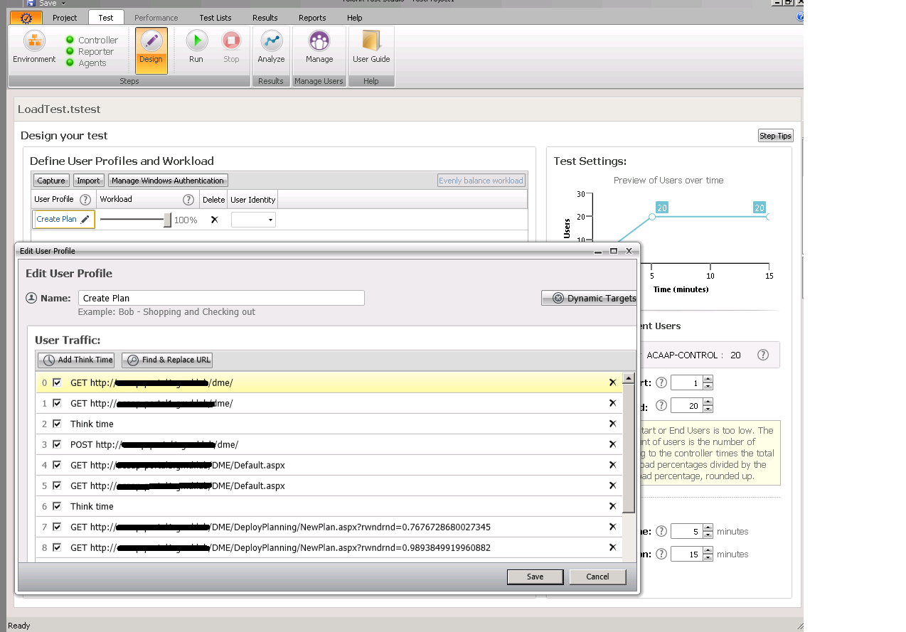 - A Fiddler trace of the load test trying to run. Make sure you select Start at 1 user, end at 1 user.