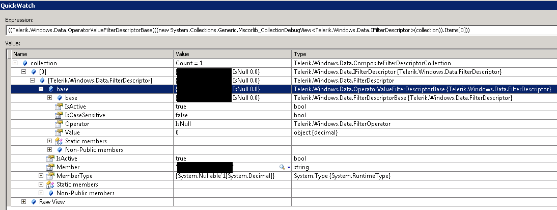In debug mode the 2 collections (when saving, and when loading) look identical to me. I have attached a screenshot of the object, with the field names blanked out just in case :). Note that I've tried supplying a dummy decimal as shown, and also OperatorValueFilterDescriptorBase.UnsetValue.