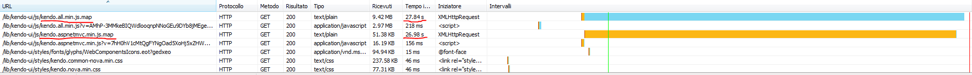 Seems like the problem is mainly with kendo.all.min.js.map, because is that one that takes a lot, kendo.aspnetmvc.min.js.map rarely takes much time (usually under 0.5 seconds), maybe his time is due to the long loading of kendo.all.min.js.map. Furthermore, from previous screenshot you can see that kendo.aspnetmvc.min.js.map request time is long as response time of kendo.all.min.js.map.