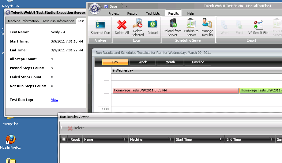 In addition, in both cases (after on-demand tests, or scheduled tests) when i click "Manage Results," the field is empty - even though I have instances on my calender that tests have executed. Shouldn't a test run generate some kind of report...something i can pass on to my team lead to show him test progress?