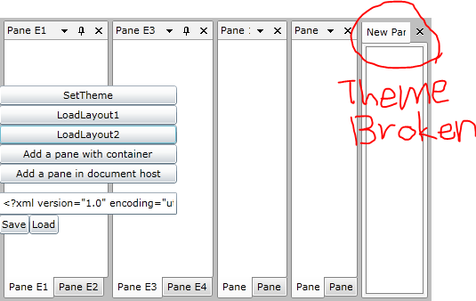 5) Click 'LoadLayout2' button, then it will load MyLayout2.xml and the style of 'New Pane 1' Pane will be broken. (screenshot #04)