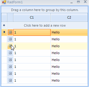 Private Async Sub RadGridView1_RowSourceNeeded(sender As Object, e As GridViewRowSourceNeededEventArgs) Handles RadGridView1.RowSourceNeeded 'Add 3 sub rows Dim row1 As GridViewRowInfo = e.Template.Rows.NewRow row1.Cells(0).Value = "Test 1" e.SourceCollection.Add(row1) Dim row2 As GridViewRowInfo = e.Template.Rows.NewRow row2.Cells(0).Value = "Test 2" e.SourceCollection.Add(row2) Dim row3 As GridViewRowInfo = e.Template.Rows.NewRow row3.Cells(0).Value = "Test 3" e.SourceCollection.Add(row3) End Sub