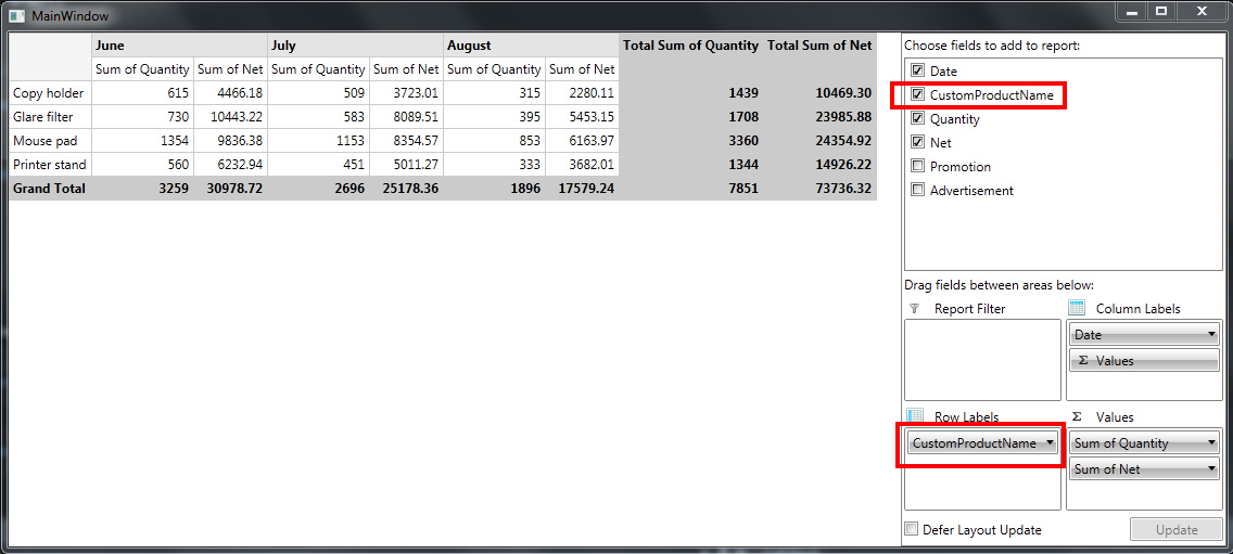 In both, PivotGrid and PivotFieldList, they show only the original property name of my object.