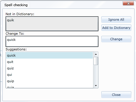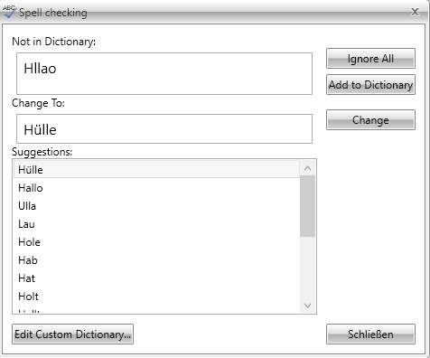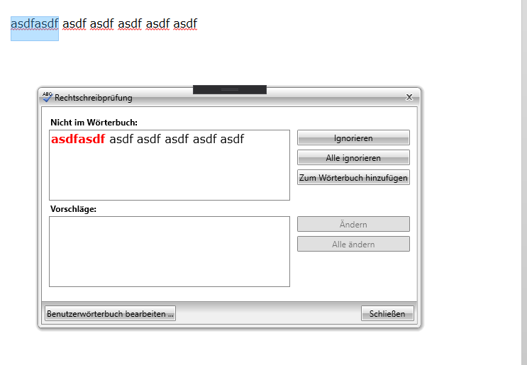 As you can see on screenshot "spellchecking" the Spellchecking-Dialog is not translated correctly. The button "close" is the only button that has the correct translation "Schließen".