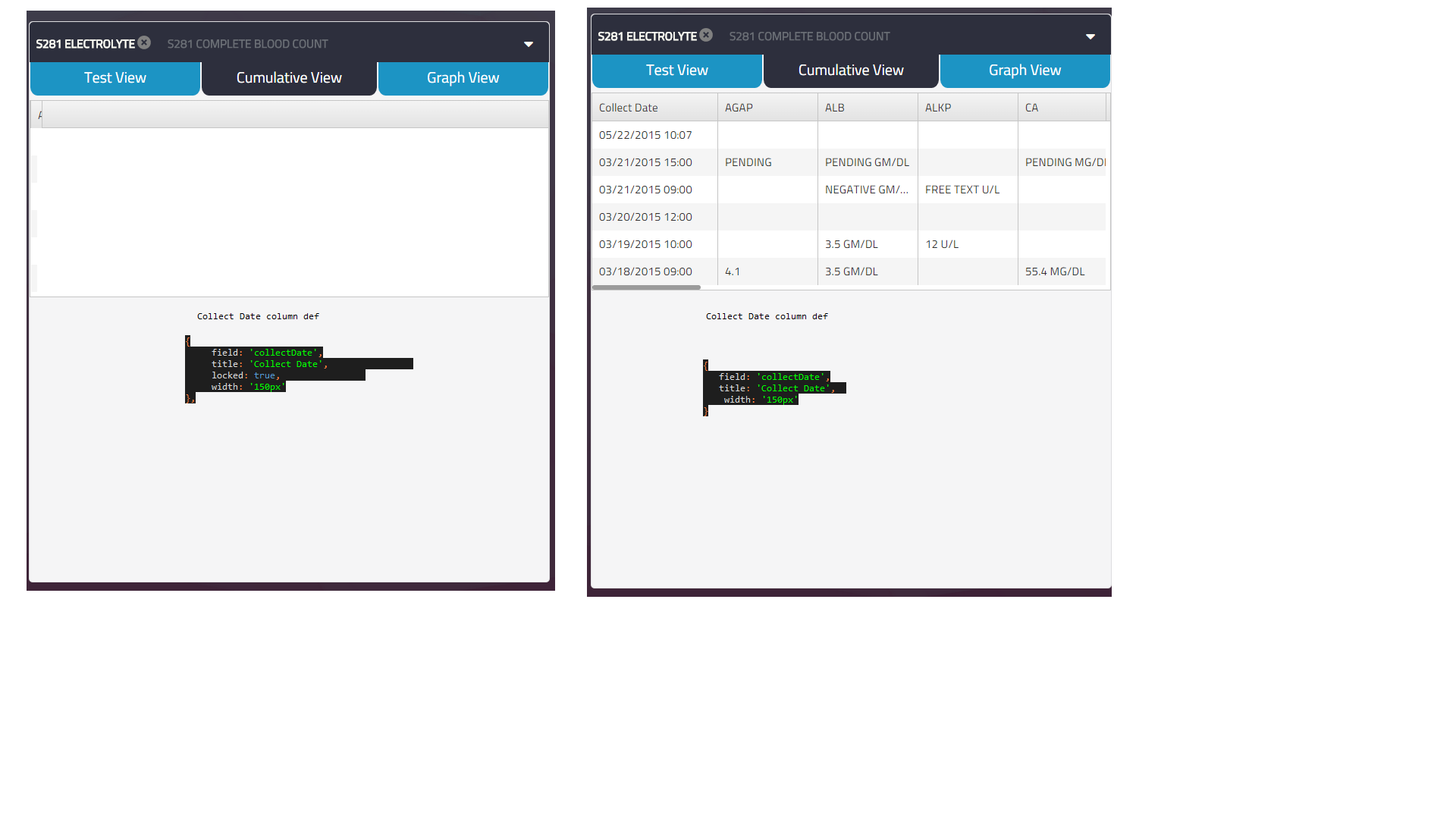 01.$scope.showUnits = function (dataItem, testCode) {02. if (dataItem['testCode' + testCode] !== undefined)03. return dataItem[testCode].units === 'N';04. else return false;05.}06.var gridColumns = [07. {08. field: 'collectDate',09. title: 'Collect Date', 10. locked: true, 11. width: '150px'12. },13.];14.angular.forEach(uniqueTestCodes, function (testCode, key) {15. gridColumns.push({16. field: 'testCode'+testCode,17. title: testCode,18. template:kendo.format($('#clinReportCellTemplate')[0].innerHTML,testCode),19. width:'120px'20. });21.});22. 23.$scope.reportGridData = gridData;24.$scope.resultGridOptions = {25. dataSource: { data: gridData },26. columns: gridColumns,27.};