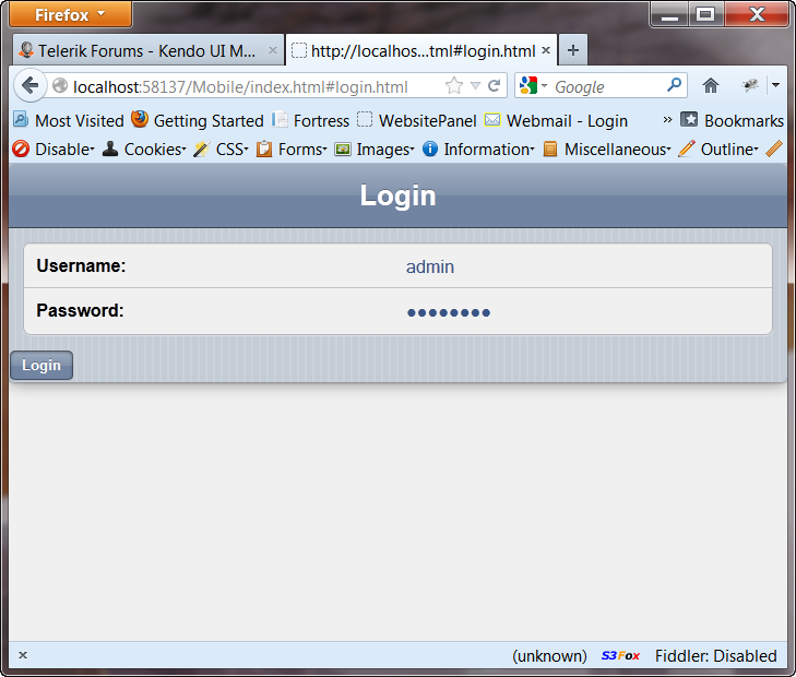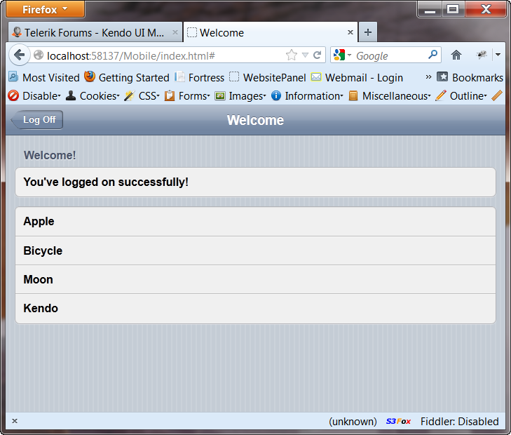 <!DOCTYPE html><html><head> <title></title> <link href="../Content/kendo/2012.3.1114/kendo.mobile.all.min.css" rel="stylesheet" /></head><body> <div data-role="view" id="welcome-view" data-title="Welcome" data-model="itemsViewModel" data-layout="databinding"> <ul data-role="listview" data-style="inset" data-type="group"> <li>Welcome! <ul> <li>You've logged on successfully!</li> </ul> </li> </ul> <ul data-role="listview" id="items-list" data-style="inset" data-template="itemsListViewTemplate" data-model="itemsViewModel" data-bind="source: itemsDataSource"> </ul> </div> <script type="text/x-kendo-template" id="itemsListViewTemplate"> #= ItemName # </script> <!-- *************************** Begin Layout Section ****************************************** --> <section data-role="layout" data-id="databinding"> <header data-role="header"> <div data-role="navbar"> <a class="nav-button" data-role="backbutton" data-align="left" href="#" data-click="logoff">Log Off</a> <span data-role="view-title"></span> </div> </header> </section> <!-- *************************** End Layout Section ****************************************** --> <script src="../Scripts/kendo/2012.3.1114/jquery.min.js" type="text/javascript"></script> <script src="../Scripts/kendo/2012.3.1114/kendo.all.min.js" type="text/javascript"></script> <script> var app = new kendo.mobile.Application(document.body, { transition: "slide" }); </script> <script> //Handle unauthorized Ajax errors by redirecting to login $(document).ajaxError(function (e, xhr, settings, exception) { if (xhr.status == 401) { app.navigate("login.html"); return; } }); var validator, itemsViewModel = kendo.observable({ itemsDataSource: new kendo.data.DataSource({ transport: { read: { url: "/api/dummy/getitems", type: "GET", dataType: "json" }, parameterMap: function (options, operation) { return kendo.stringify(options); } }, batch: false, pageSize: 10, schema: { data: "Data", model: { id: "Id", fields: { Id: { editable: false, nullable: false, type: "number" }, ItemName: { type: "string" } } } } }) }); function logoff() { $.post("/fakeaccount/_logoff", function (response) { if (response.Success) { app.navigate("login.html"); } }); } </script></body></html><!DOCTYPE html><html><head> <title></title></head><body> <div class="km-modalview km-view" data-role="view" id="modalview-login" style="width: 100%; height: auto;" data-style="inset"> <div class="km-header" data-role="header"> <div class="km-navbar" data-role="navbar"> <div class="km-view-title"> <span>Login</span> </div> </div> </div> <div class="km-listview-wrapper"> <ul class="km-listview km-list km-listinset" data-role="listview" data-style="inset"> <li> <label for="username">Username:</label> <input type="text" id="username" /> </li> <li> <label for="password">Password:</label> <input type="password" id="password" /> </li> </ul> </div> <div id="login-message"></div> <a class="km-button" data-click="authenticateUser" id="modalview-login-button" data-role="button"><span class="km-text">Login</span></a><br /> </div> <script> function authenticateUser() { var userName = $("#username").val(); var password = $("#password").val(); var $msg = $("#login-message"); $.ajax({ url: "/fakeaccount/_login", data: { UserName: userName, Password: password, RememberMe: false }, dataType: "json", type: "POST", success: function (data) { if (data.Success) { $msg.hide(); app.navigate(""); } else { $msg.html(data.Message).show(); } }, error: function (xhr, status, error) { alert(xhr.responseText) } }); } </script></body></html>using System;using System.Linq;using System.Web.Mvc;using System.Web.Security;using KendoUIMobileLoginLogoff.Models;namespace KendoUIMobileLoginLogoff.Controllers{ /// <summary> /// This is a fake Account controller that will login and logoff users. /// </summary> public class FakeAccountController : Controller { #region Login Methods /// <summary> /// Log the user in via the Mobile application. /// </summary> /// <param name="userName">The userName</param> /// <param name="password">The password</param> /// <param name="rememberMe">The boolean value for remembering the users username.</param> /// <returns></returns> [HttpPost] public ActionResult _login(string userName, string password, bool rememberMe) { JsonResponse response = new JsonResponse(); response.Success = false; response.Message = "Username or password is invalid."; if (userName == "admin" && password == "password") { FormsAuthentication.SetAuthCookie(userName, rememberMe); response.Success = true; response.Message = ""; } return Json(response); } #endregion #region LogOff Methods /// <summary> /// Log the user off. /// </summary> /// <returns></returns> [HttpPost] public ActionResult _logoff() { FormsAuthentication.SignOut(); JsonResponse response = new JsonResponse(); response.Success = true; response.Message = ""; return Json(response); } #endregion }}using System;using System.Collections.Generic;using System.Linq;using System.Net;using System.Net.Http;using System.Web.Http;using System.Web.Http.ModelBinding;using Kendo.Mvc.Extensions;using Kendo.Mvc.UI;using KendoUIMobileLoginLogoff.Models;namespace KendoUIMobileLoginLogoff.Controllers.Api{ /// <summary> /// This dummy Api controller fetches a list of data, but if first /// checks to see if the user is authenticated. If the user is not, /// then it throws a 401 "Unauthorized" exception. This is caught /// by the jQuery function in the index.html page and redirects /// to the login.html page. /// </summary> public class DummyController : ApiController { public DataSourceResult GetItems([ModelBinder(typeof(KendoUIMobileLoginLogoff.ModelBinders.DataSourceRequestModelBinder))]DataSourceRequest request) { if (!User.Identity.IsAuthenticated) { throw new HttpResponseException(new HttpResponseMessage(HttpStatusCode.Unauthorized)); } var items = new List<ItemModel>() { new ItemModel() { Id = 1, ItemName = "Apple" }, new ItemModel() { Id = 2, ItemName = "Bicycle" }, new ItemModel() { Id = 3, ItemName = "
