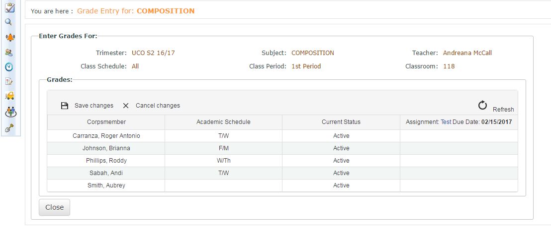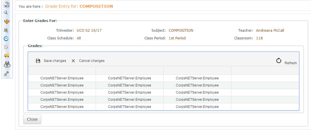 public partial class GradesByClass : CorpsNET.BasePage{ CorpsNETServer.ScheduledClass _scheduledClass; CorpsNETServer.Lookup _academicSchedule; CorpsNETServer.AcademicAssignment _academicAssignment; protected void Page_Load(object sender, EventArgs e) { base.Page_Load(sender, e); if (Request.QueryString["ScheduledClassID"] != null) { _scheduledClass = ScheduledClassService.GetByID(Int32.Parse(Request.QueryString["ScheduledClassID"])); } if (!Page.IsPostBack) { if (((UserProfile)Session["_userProfile"]).IsAuthorized("Grades - Edit") == true) { Master.SetLocation("GradesByClass.aspx", "Grade Entry for: <b>" + _scheduledClass.SubjectName + "</b>", true); } else { throw new CorpsNETServer.CorpsNETAuthException("Grades - Edit"); } //rdpRosterDate.SelectedDate = DateTime.Now; lblClassPeriod.Text = _scheduledClass.ClassPeriodName; lblClassroom.Text = _scheduledClass.ClassroomName; lblClassSchedule.Text = _scheduledClass.ClassroomScheduleName; lblSubject.Text = _scheduledClass.SubjectName; lblTeacher.Text = _scheduledClass.TeacherName; lblTrimester.Text = _scheduledClass.TrimesterName; LoadGridStructure(); } } public void LoadGridStructure() { radGridGrades.Columns.Add(new GridBoundColumn() { ReadOnly=true, UniqueName = "Corpsmember", DataField = "EmployeeName", HeaderText = "Corpsmember", SortExpression = "EmployeeName" }); radGridGrades.Columns.Add(new GridBoundColumn() { ReadOnly = true, UniqueName = "AcademicScheduleName", DataField = "AcademicScheduleName", HeaderText = "Academic Schedule", SortExpression = "AcademicScheduleName" }); radGridGrades.Columns.Add(new GridBoundColumn() { ReadOnly = true, UniqueName = "CurrentStatusName", DataField = "CurrentStatusName", HeaderText = "Current Status", SortExpression = "CurrentStatusName" }); List<AcademicAssignment> _academicAssignemnts = AcademicAssignmentService.GetForScheduledClass(_scheduledClass.ID); for (int i = 0; i < _academicAssignemnts.Count; i++) { radGridGrades.Columns.Add(new GridBoundColumn() { UniqueName = _academicAssignemnts[i].ID.ToString(), HeaderText = "Assignment: <a href='#' class='RadGrid_CorpsNETBootstrap_a' onclick =openEditAcademicAssignmentWindow(" + _academicAssignemnts[i].ID + "); return false;>" + _academicAssignemnts[i].Name + "</a> Due Date: <b>" + _academicAssignemnts[i].DueDateString + "</b>" }); } } public void LoadStudents() { radGridGrades.DataSource = EmployeeService.GetForScheduledClass(_scheduledClass.ID); } protected void radGridGrades_ItemDataBound(object sender, GridItemEventArgs e) { if (e.Item is GridDataItem) { GridEditableItem form = (GridEditableItem)e.Item; int employeeid = Int32.Parse(e.Item.OwnerTableView.DataKeyValues[e.Item.ItemIndex]["ID"].ToString()); //goto through all the assignments and load any existing grades for that assignment List<AcademicAssignment> _academicAssignments = AcademicAssignmentService.GetForScheduledClass(_scheduledClass.ID); for (int i = 0; i < _academicAssignments.Count; i++) { //radGridGrades.Columns.Add(new GridBoundColumn() { UniqueName = _academicAssignemnts[i].ID.ToString(), HeaderText = "Assignment: <b>" + _academicAssignemnts[i].Name + "</b> Due Date: <b>" + _academicAssignemnts[i].DueDateString + "</b>" }); //get the grade for this assignment and Employee Grade _grade = GradeService.GetForAcademicAssignment(employeeid, _academicAssignments[i].ID); if (_grade != null) { if (_academicAssignments[i].LetterGrade == true) form[_academicAssignments[i].ID.ToString()].Text = _grade.LetterGrade; else form[_academicAssignments[i].ID.ToString()].Text = _grade.Points.ToString(); } else form[_academicAssignments[i].ID.ToString()].Text = string.Empty; } } } protected void radGridGrades_NeedDataSource(object source, Telerik.Web.UI.GridNeedDataSourceEventArgs e) { LoadStudents(); } protected void radGridGrades_BatchEditCommand(object sender, GridBatchEditingEventArgs e) { //todo }}