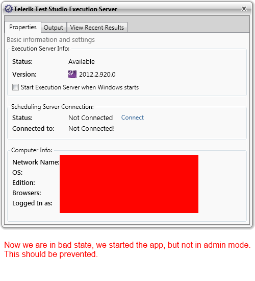 - Start execution server at startup does not work (read: is useless). It must be executed as administrator. - I was not able to reproduce this i.e. it worked when I tried it in my environment. Would you please give me the necessary steps to reproduce the problem. And also the environment and the Test Studio version you're using.