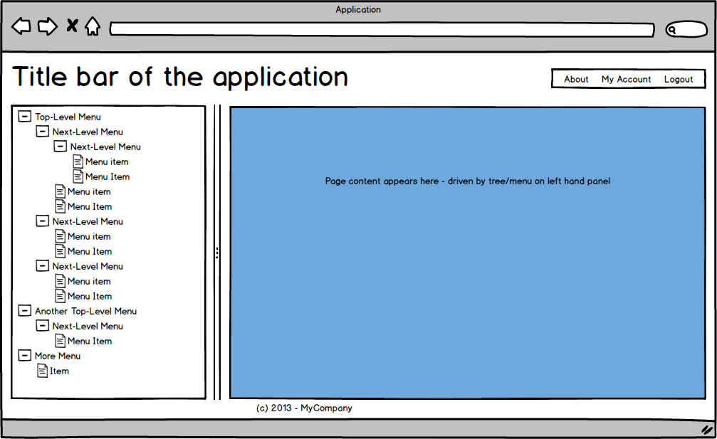 I'm looking for the same basic functionality as (here), but the tree view is a maintenance/function menu, and the right hand pane is an "index"-type page for a partial CRUD function or a user screen or whatever I need to display. This could be a grid page for a list of records which leads to a CRUD edit page, or it could be a user-function page where the user makes a series of selections.