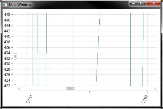 using System;using System.Windows;using System.Collections.ObjectModel;using Telerik.Windows.Controls.ChartView;namespace ZoomMajorTickInterval{ public partial class MainWindow : Window { public MainWindow() { InitializeComponent(); Random r = new Random(); MyData = new ObservableCollection<DataPoint>(); for (int ctr = 0; ctr < 500; ctr++) MyData.Add(new DataPoint() { PeriodText = "Q" + ctr.ToString(), DataValue = r.Next(1000) }); DataContext = this; CategoricalAxis axis = Chart.HorizontalAxis as CategoricalAxis; axis.MajorTickInterval = 5; Chart.HorizontalAxis.LabelInterval = 2; } public ObservableCollection<DataPoint> MyData { get; set; } } public class DataPoint { public string PeriodText {get; set;} public int DataValue { get; set; } }}Run the example and notice that initially it correctly renders major ticks every 5 data points, and labels every 2 major ticks, just as specified in the code. This displays 50 labels. Now move the max zoom slider on the horizontal axis back to about the 2/3 mark and the axis shifts from using 5 points between major ticks to 2. The labels continue to show every 2 major ticks, so now it is displaying 81 labels, which is much more crowded than desired (even more-so in my real application).