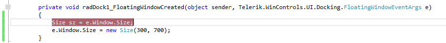 But when I put a break point in the handler for the FloatingWindowCreated event and check the size of the window it is the default 300x300 still.