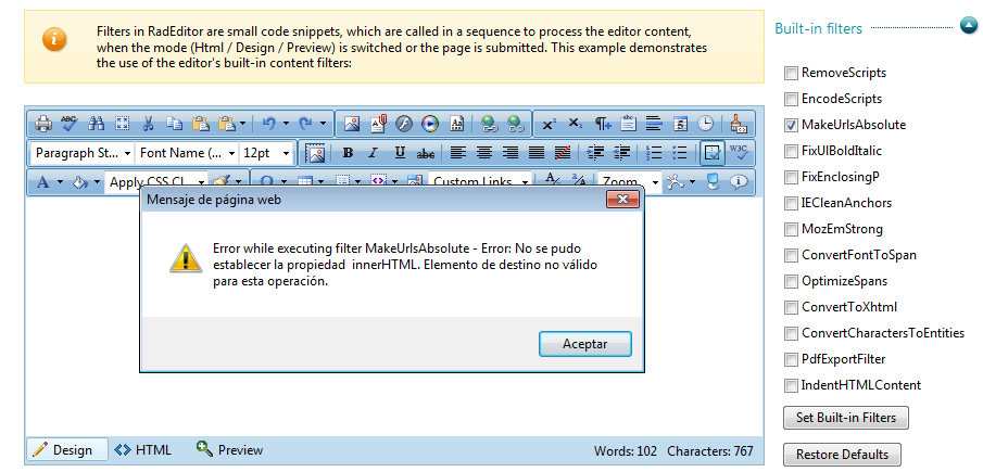 I have downloaded the trial from your site and when a set MakeUrlsAbsolute property to Enabled, it shows an error in Editor even when i only have this code in html view: