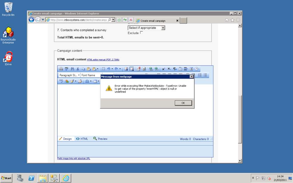 Log into www.inboxsystems.com with email of telerik@telerik.com and password of telerik5. Hover over the 'Email campaign' menu option and then click 'create campaign'. You will see the error displayed on that page. It occurs on all pages where I use the HTML Editor.
