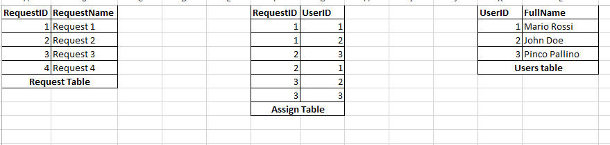 We have a database situation as described in the attached screenshot: We have one Request Table, one User Table and an Assignment Table that manage the many to many relationship of the first two tables.