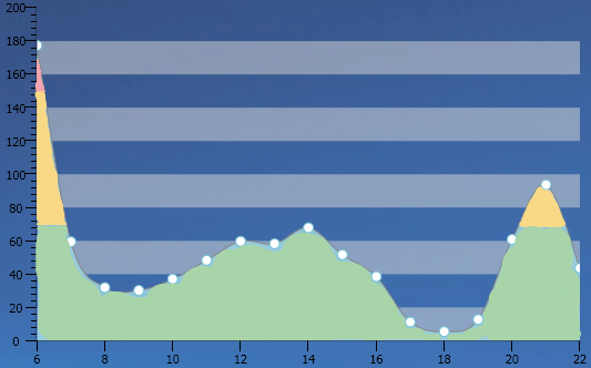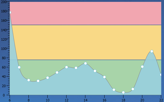 public MainPage() { InitializeComponent(); List<Manufacturer> data = new List<Manufacturer>(); data.Add(new Manufacturer("Monday", "Dave", 14, 111)); data.Add(new Manufacturer("Tuesday", "Dave", 1, 122)); data.Add(new Manufacturer("Wednesday", "Dave", 3, 155)); this.telerikChart.ItemsSource = data; LinearGradientBrush brush1 = new LinearGradientBrush(); GradientStop stop1 = new GradientStop(); stop1.Offset = 0.2; stop1.Color = Colors.Red; GradientStop stop2 = new GradientStop(); stop2.Offset = 0.5; stop2.Color = Colors.Blue; brush1.GradientStops.Add(stop1); brush1.GradientStops.Add(stop2); brush1.StartPoint = new Point(0.5, 0); brush1.EndPoint = new Point(0.5,1); telerikChart.DefaultView.ChartArea.PaletteBrushes.Add(brush1); }This would allow you to not use the marked zones, and achieve an effect which is less obtrusive.