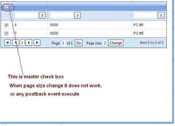 I have created a user control along with ordering, paging etc. On the first time when grid loads, master check box work good but after clicking on column for ordering, master check box did not work.