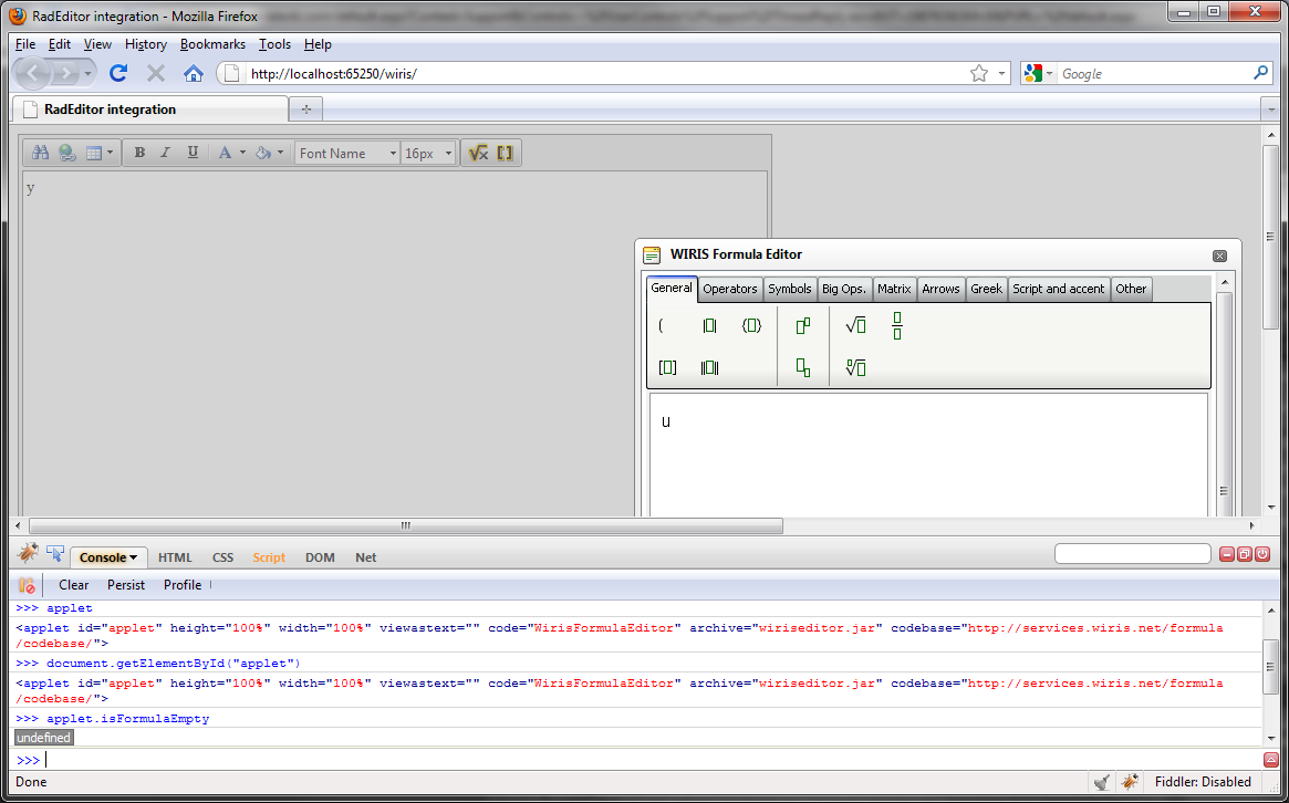Can anyone let me know, whether i can use the same kind of integartion of wiris math editor and RadEditor in silverlight. I tried that but i am getting some errors as shown below. Also let me know if i can integrate to RadRichTextbox control of silverlight?
