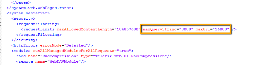 This is a security feature. Do not change this feature unless the scope of the change is fully understood. You can configure the IIS server to reject requests whose query string is greater than a specified value. If the request's query string is greater than the configured value, this error is returned. If the allowed length of the query string needs to be increased, modify the configuration/system.webServer/security/requestFiltering/requestLimits@maxQueryString setting.