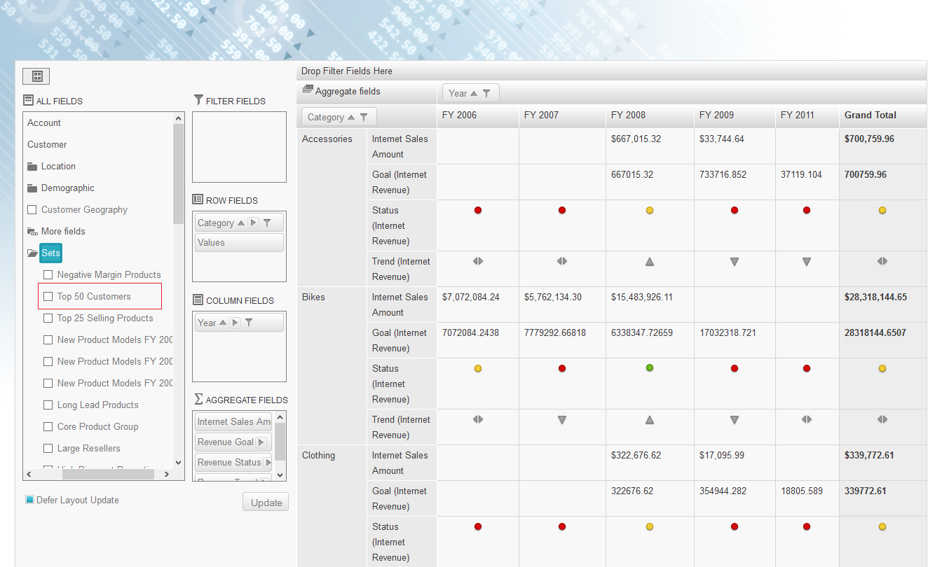 I am using the RadPivotGrid to navigate a OLAP cube on Microsoft Analysis Service. The control connects to the cube through Adomd connection string.