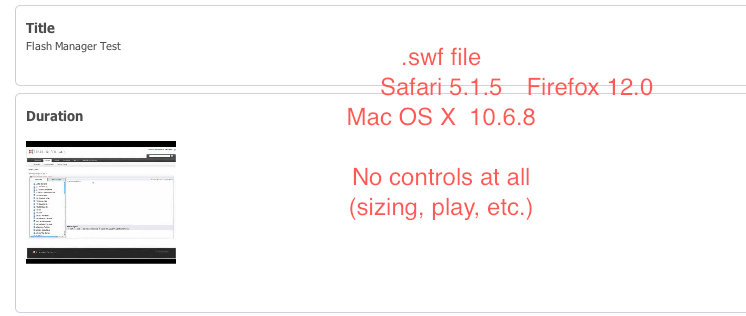 In order to play flash videos SWF files in the browsers running on Mac OS, you need to install the Adobe Flash Player plug-in. You can see that the flash is played on my end: http://screencast.com/t/L4Se9KwBKp0.