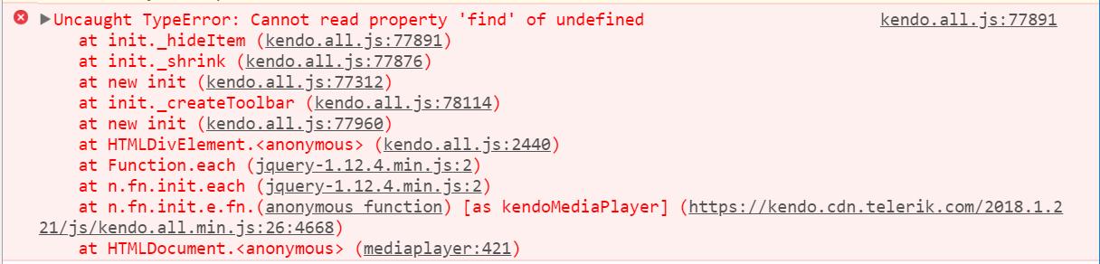 By way of sample code, the example on https://demos.telerik.com/aspnet-mvc/mediaplayer exhibits the same issue. When under ~970 pixels in width, the Media player refuses to render, and the JavaScript console outputs and error, both in Chrome and Edge (attachments 1 and 2).