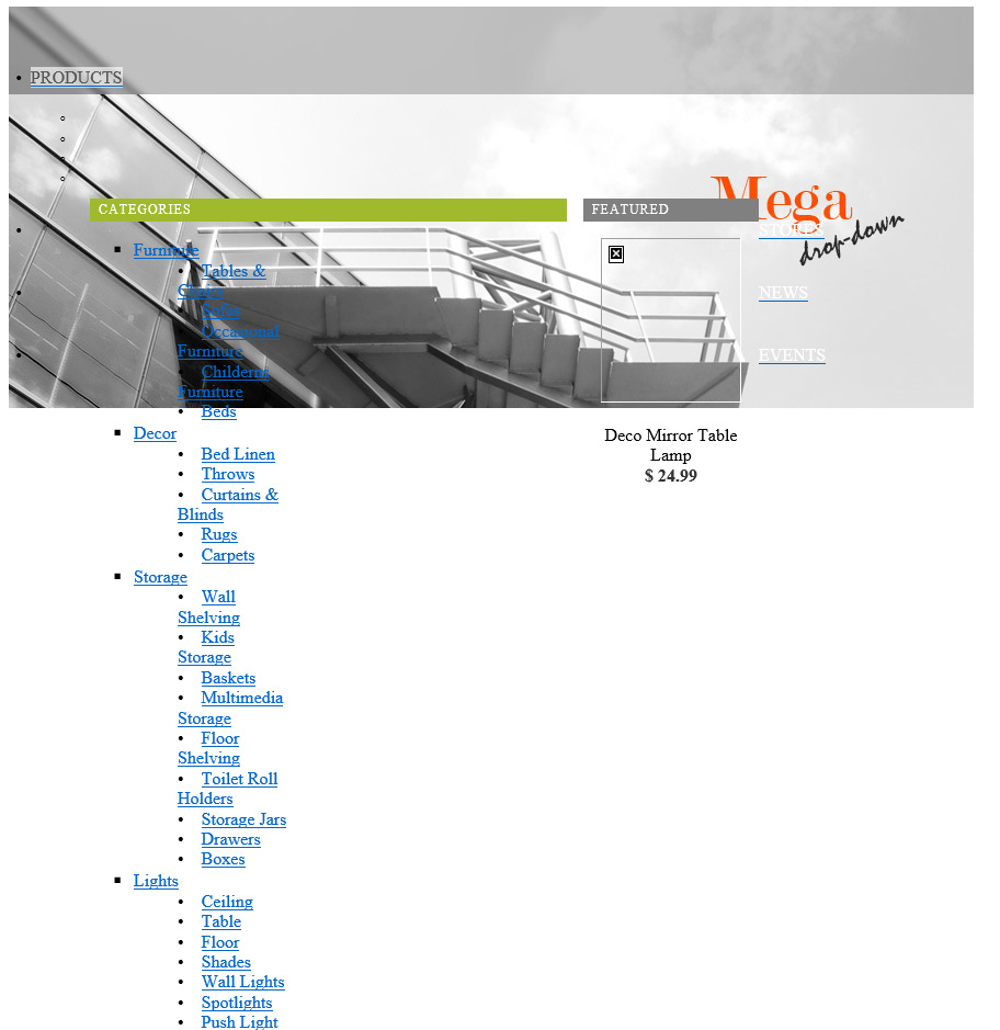 Utilizing the Mega Menu demo (http://demos.telerik.com/aspnet-ajax/menu/examples/megadropdown/defaultcs.aspx) I get the display showing as shown in the attached. I have the DefaultCS.aspx and the styles.css copied exactly from the site and have copied the images into the Img directory.