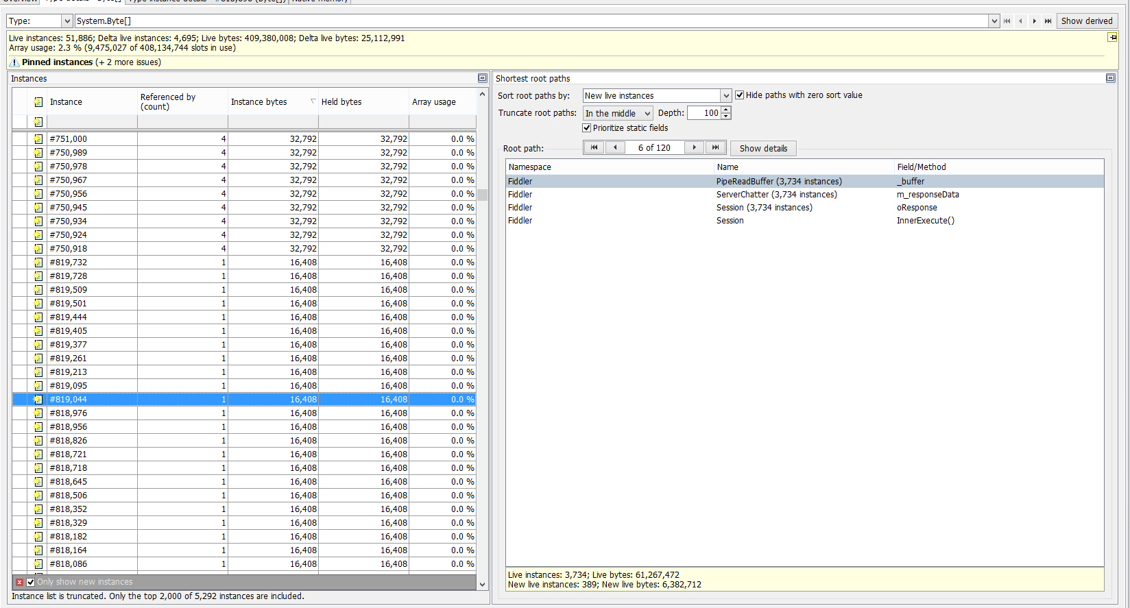 My application memory leak, the FiddlerCore4.dll version is 4.4.8.4, I use NET.Memory.Profiler check , find many byte[] object,