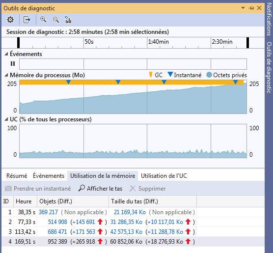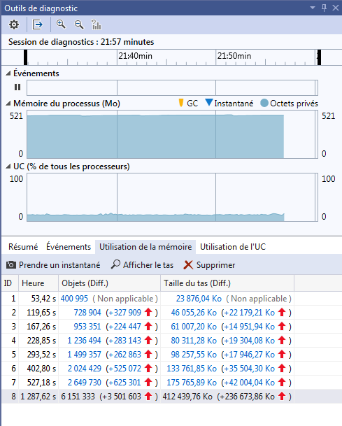 In the demo, there are two data collections. If I refresh 50 elements in each collections, the memory will leak very fast. Please see the memory diagnosis trace in the attached photos.