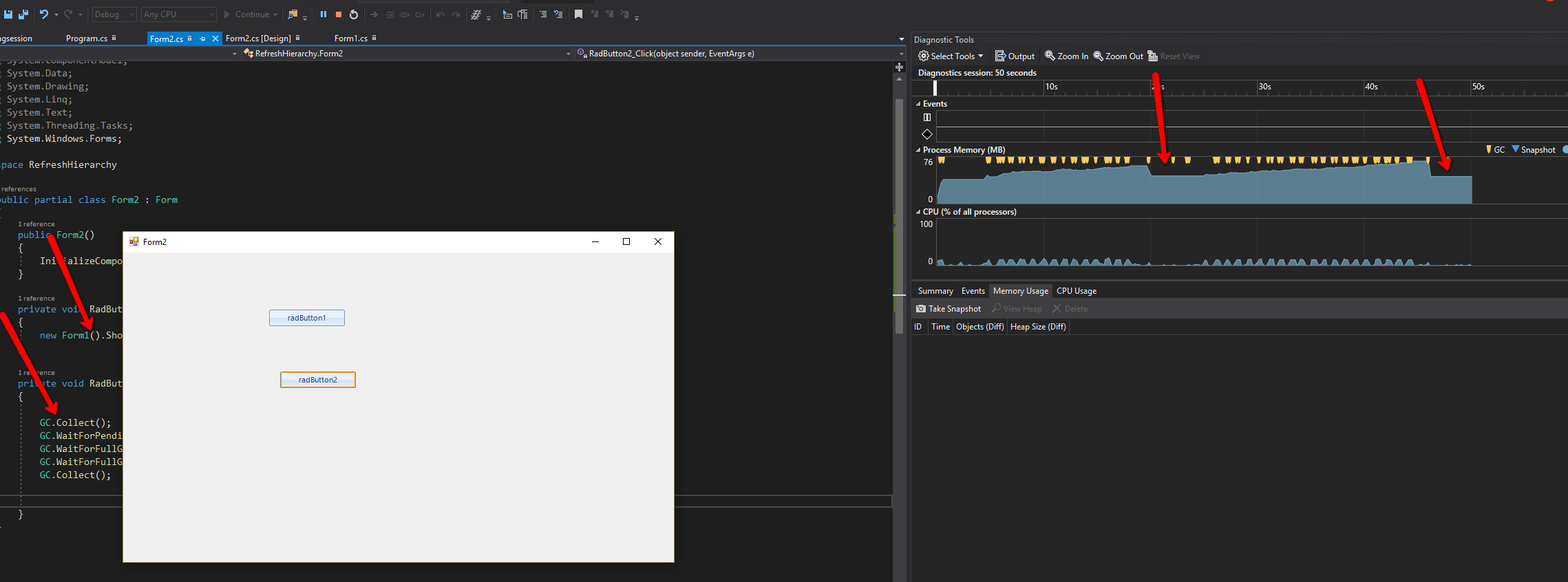 Please note that the garbage collector is non-deterministic and you cannot be sure when it will be executed. In order to properly test this, you need to force the garbage collector after the form is closed. When this is done the memory levels are restored (see attached). I have attached a modified version of the test project as well.