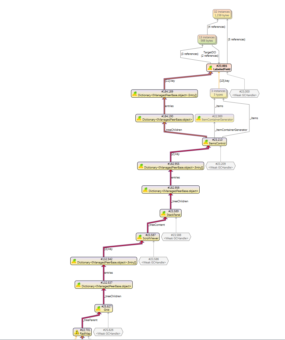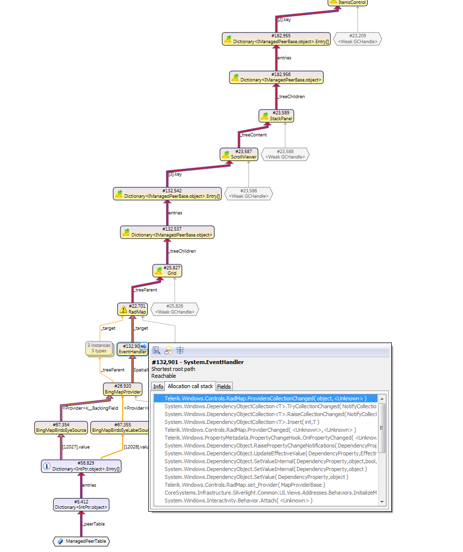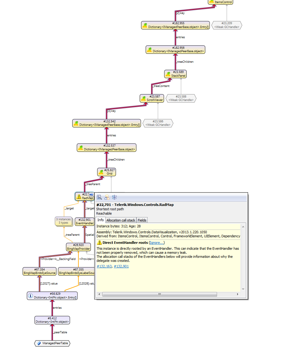 public class InitializeMapBehavior : Behavior<RadMap> { protected override void OnAttached() { base.OnAttached(); var map = this.AssociatedObject; map.Provider = new BingMapProvider(MapMode.Road, true, BingMapCredentialsWrapper.ApiKey); } }When I enter and leave this view and I take a snapshot of the memory each time, the number of instances of a control which is used several times in the same grid increases steadily and they are never released. Apparently RadMap can not be collected and since it holds a reference to its parent, nothing can be collected.
