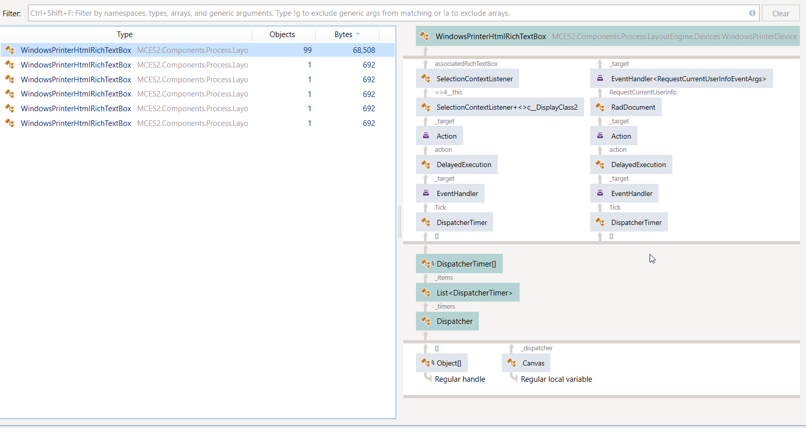 I am getting a memory leak problem with Radrichtextbox. I continually create a rich text bus and print. this Radrichtextbox was added to the canvas container then its measured child size and arranged elements every time it went from this procedure it increased huge memory and never goes down, for example, creating 500 Radrichtextbox consumes more than 400 memory. I saw an increase when the parent container try to measure with the specific size and then arrange it and update the layout. I am unable to find which thing retains Radrichtextbox alive in memory. I attached some memory screenshots. i am using telerik version 2021. 1. 119. 45