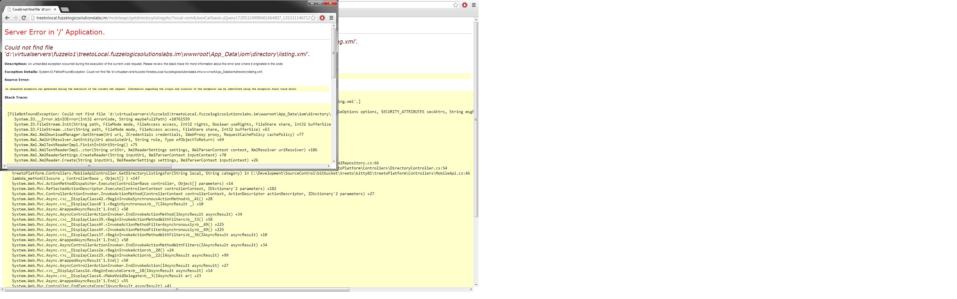 I tried to recreate the problem but making a request to http://treetolocal.fuzzelogicsolutionslabs.im/mobileapi/getdirectorylistingsfor?local=iom&JsonCallback=jQuery17205324998481664807_1353311467125 returned an exception (actual browser screen is attached as a screenshot). Can you provide a working JSONP endpoint which we can test with?