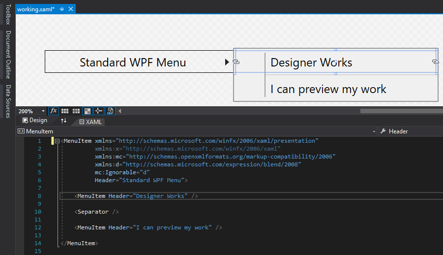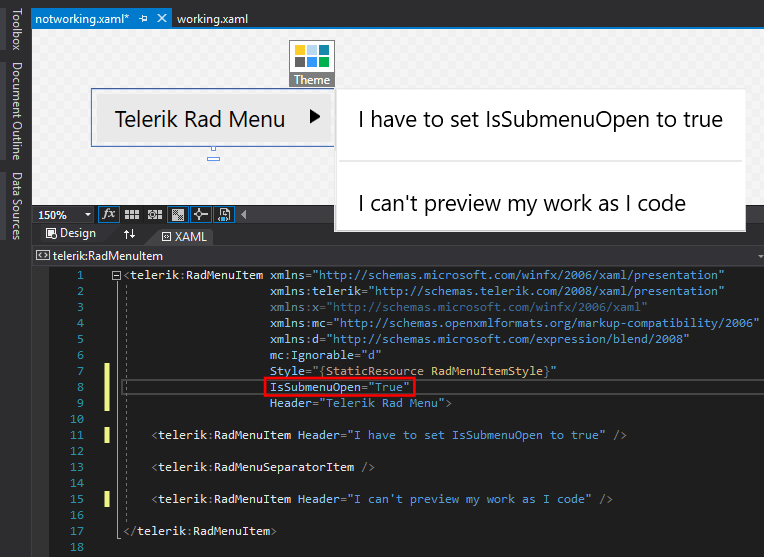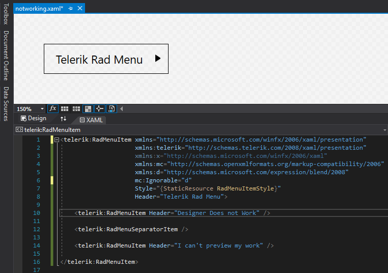 We've recently started replacing standard WPF controls with their Telerik counterparts in our project and we've noticed that Telerik menu items are not visible at design time where the standard WPF menu items are. Is this a bug?