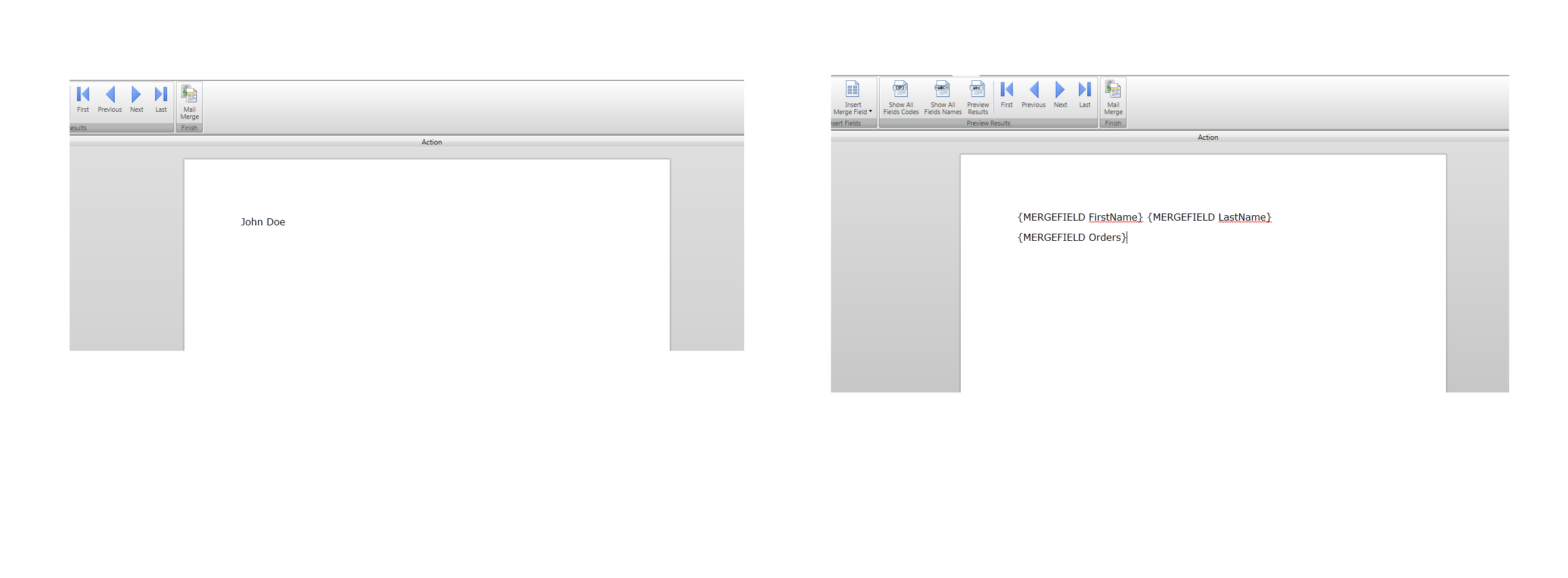 public class CustomMergeField : MergeField{ private const string CustomFieldName = "CustomField"; static CustomMergeField() { CodeBasedFieldFactory.RegisterFieldType(CustomMergeField.CustomFieldName, () => { return new CustomMergeField(); }); } public override string FieldTypeName { get { return CustomMergeField.CustomFieldName; } } public override Field CreateInstance() { return new CustomMergeField(); } protected override DocumentFragment GetResultFragment() { Customer customer = this.Document.MailMergeDataSource.CurrentItem as Customer; if (customer == null) { return null; } if (this.PropertyPath == "Orders") { Table table = new Table(); foreach (Order order in customer.Orders) { Span span = new Span(order.ProductName); Paragraph paragraph = new Paragraph(); paragraph.Inlines.Add(span); TableCell cell = new TableCell(); cell.Blocks.Add(paragraph); TableRow row = new TableRow(); row.Cells.Add(cell); table.AddRow(row); } Section section = new Section(); section.Blocks.Add(table); RadDocument document = new RadDocument(); document.Sections.Add(section); document.MeasureAndArrangeInDefaultSize(); return new DocumentFragment(document); } return null; }Don't hesitate to contact us if you have other questions.