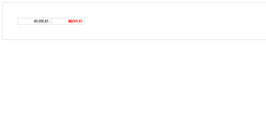 <%@ Page Language="vb" AutoEventWireup="false" CodeBehind="Numeric_Bug.aspx.vb" Inherits="Elan.Web.Numeric_Bug" %><!DOCTYPE html PUBLIC "-//W3C//DTD XHTML 1.0 Transitional//EN" "http://www.w3.org/TR/xhtml1/DTD/xhtml1-transitional.dtd"><html xmlns="http://www.w3.org/1999/xhtml"><head id="Head1" runat="server"> <title></title> <style type="text/css"> .disabledNumericTextbox { color: Red; } .disabledNumericTextboxBroken { color: Red !important; } </style></head><body> <form runat="server" id="form1"> <telerik:RadScriptManager ID="RadScriptManager1" runat="server" /> <div style="padding: 50px; border: 1px solid #ccc"> <telerik:RadNumericTextBox runat="server" ID="RadNumericTextBox3" ReadOnly="true" ReadOnlyStyle-CssClass="disabledNumericTextbox" NumberFormat-DecimalDigits="2" Value="80000.85" Width="110" ReadOnlyStyle-HorizontalAlign="Right" /> <telerik:RadNumericTextBox runat="server" ID="RadNumericTextBox4" ReadOnly="true" Value="80000.85" ReadOnlyStyle-CssClass="disabledNumericTextboxBroken" NumberFormat-DecimalDigits="2" Width="110" ReadOnlyStyle-HorizontalAlign="Right" /> </div> <telerik:RadWindowManager ID="RadWindowManager1" ShowContentDuringLoad="false" VisibleStatusbar="false" ReloadOnShow="true" runat="server" EnableShadow="true" /> </form></body></html>